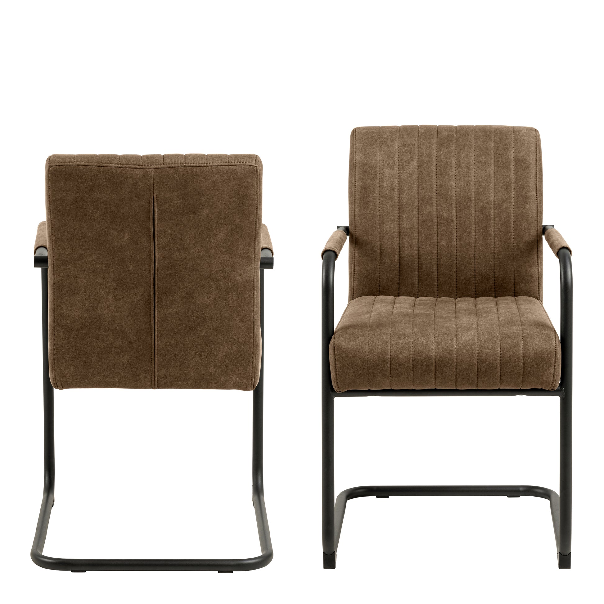 infusing retro charm into your dining space, this dining chair with armrests is sure to enhance any home's ambiance. its sturdy black swing metal base perfectly complements the light brown microfiber fabric, which boasts a special coating for a rustic, vintage-inspired appearance. plus, with a seat made of pocket springs, you'll remain comfortable throughout those post-dinner conversations.