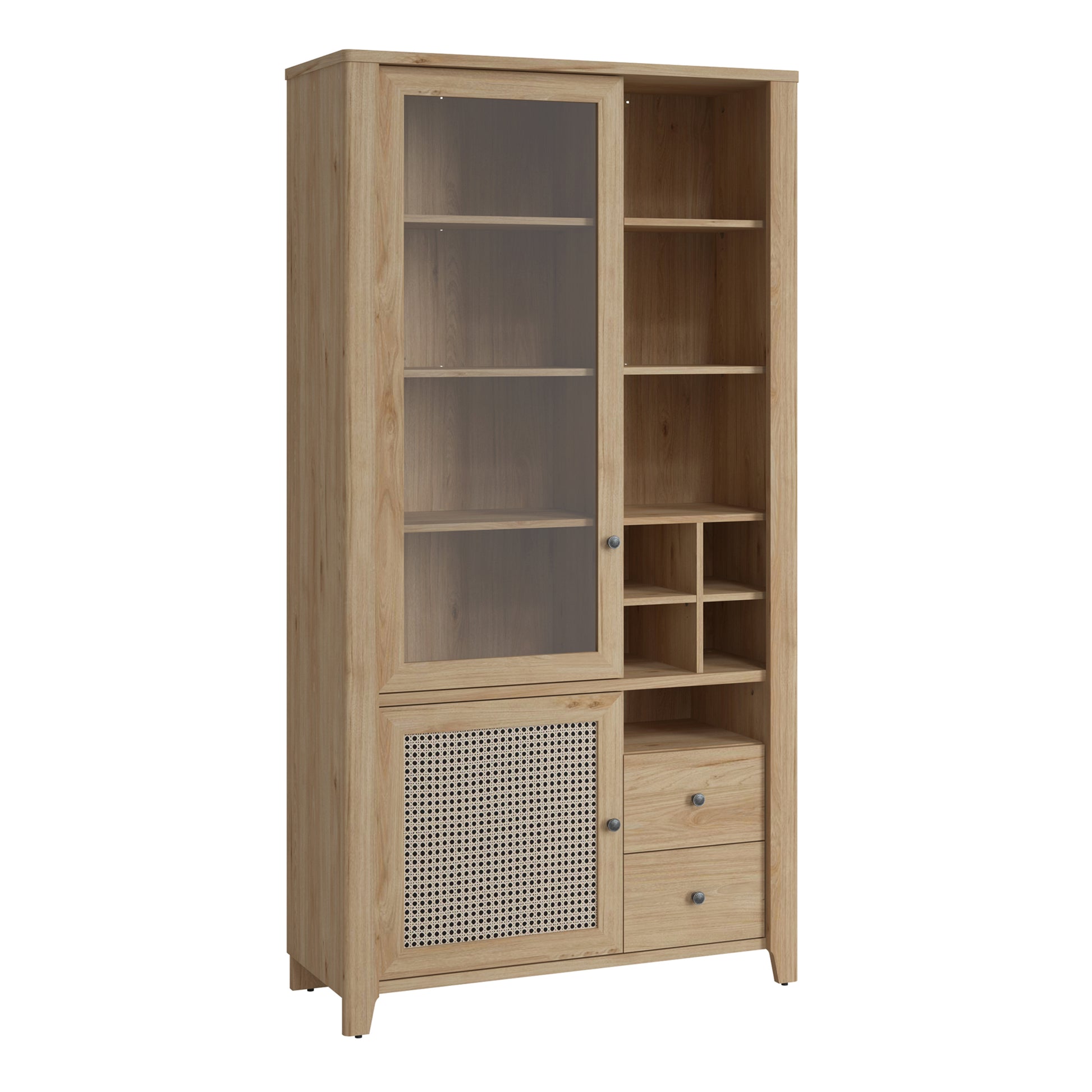 cestino 2 door 2 drawer display cabinet in jackson hickory oak and rattan effect