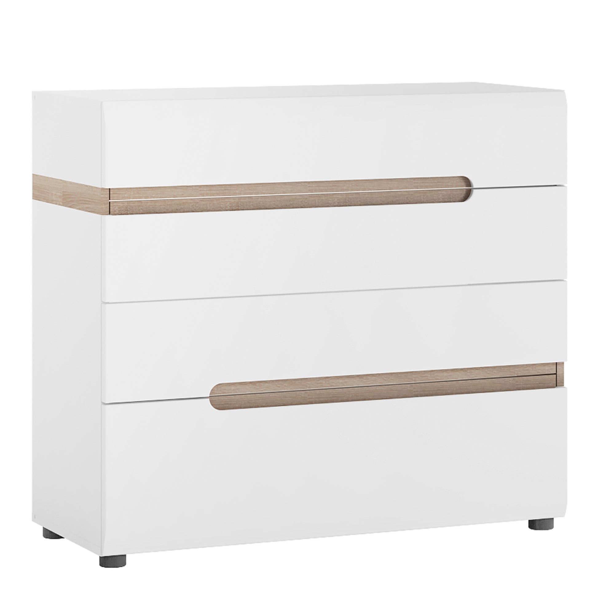 4 drawer chest in white with an truffle oak trim. unconventional design - a proposal for the followers of the latest trends. the clever mix of scratch resistant white melamine with beautiful high gloss fronts and oak melamine trim makes this top quality collection of furniture the ideal destination for the most modern of homes, the massive range that includes many cabinets and wall units fulfils every storage and display option.