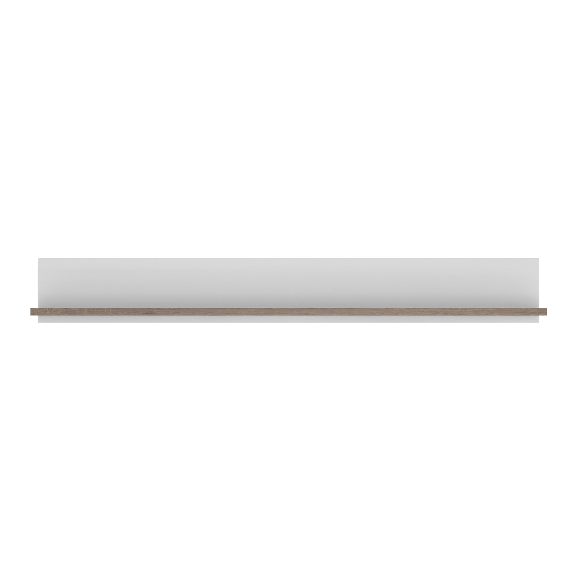 wall shelf in white with an truffle oak trim. unconventional design - a proposal for the followers of the latest trends. the clever mix of scratch resistant white melamine with beautiful high gloss fronts and oak melamine trim makes this top quality collection of furniture the ideal destination for the most modern of homes, the massive range that includes many cabinets and wall units fulfils every storage and display option.