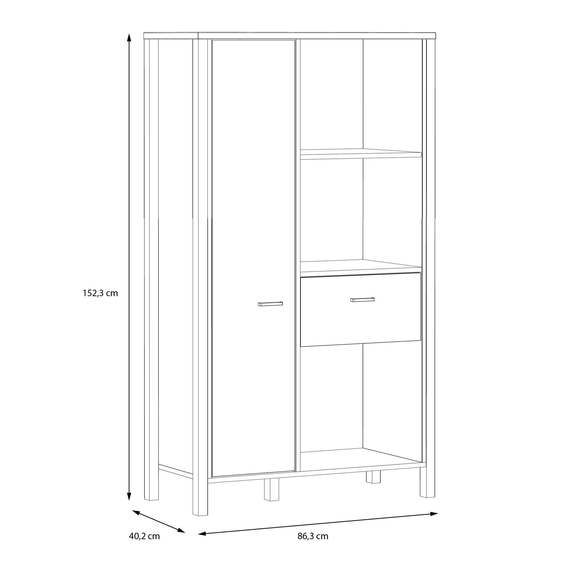 high rock, a captivating and contemporary collection which has a perfect blend of the riviera oak decor with deep black accents, this collection immediately captivates attention with its originality. the sleek black metal handles add a touch of elegance, while the tables boast robust metal legs in a frame-like design, contributing to a distinct loft character within the space. beyond its striking aesthetics, high rock prioritises functionality with its ingenious storage solutions. cabinets, chests of drawers, and display cabinets offer ample space to organise belongings, while the thoughtfully equipped tables come with practical drawers. this versatile collection effortlessly fits into any room, from the living room and dining area to the hall, youth room, or bedroom, adding a touch of sophistication and practicality to every corner of the home.