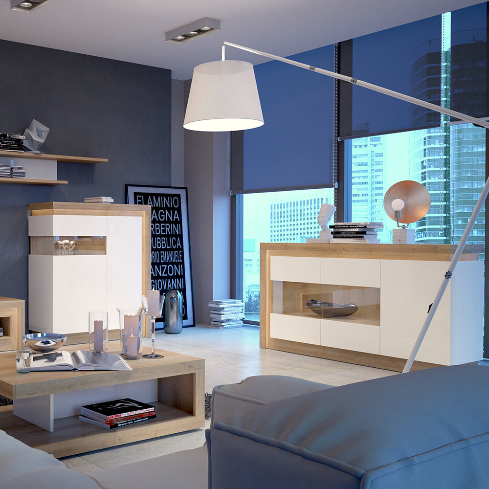 lyon designer coffee table in riviera oak/white high gloss